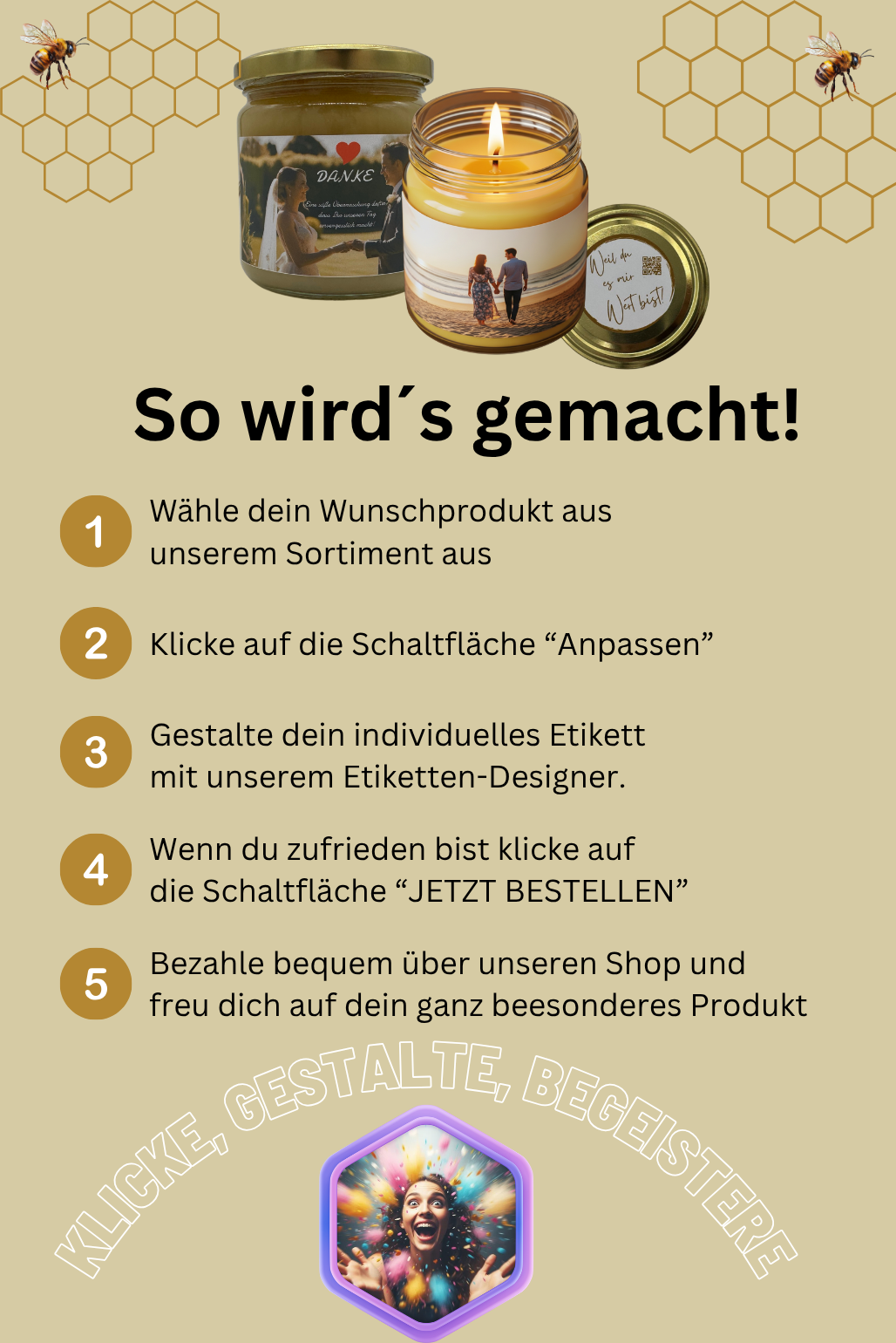 Du suchst nach einer besonderen Geschenkidee, die nicht nach kurzer Zeit in der Schublade verschwindet? Dann bist du hier genau richtig! Unsere hochwertigen Honige kannst du im Konfigurator ganz nach deinem Geschmack gestalten. Ob Foto, Bild, persönlicher Text oder deine Lieblingsfarbe – alles kannst du individuell anpassen. Oder du entscheidest dich für eine unserer stylischen Vorlagen mit einer passenden Grußbotschaft.
